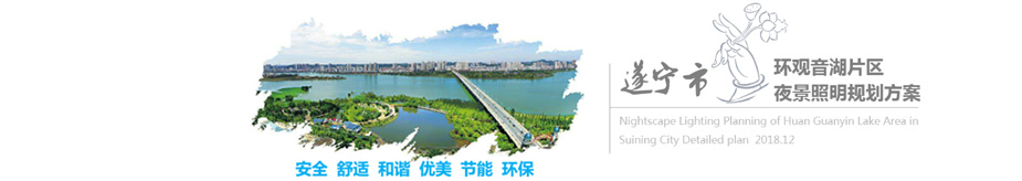 遂寧城市夜景照明建設應以“點、線、面”相結合的方式立體發展城市景觀照明。重點實施環觀音湖片區及一江兩岸夜景照明的夜景觀建設。 “點” 以標志性建筑、重要建筑物、好人廣場、犀牛廣場、圣蓮島等景觀節點 “線” 以城市主干道(五彩繽粉路、濱江路、培江水系、通德大橋、通善大橋、。 “面” 以城市城西:商業區,城中:住宅區,城西:商務區城北:高新產旅游文化業鏈為面。各片區職能需求,在功能照明滿足的同時兼并利用各片區肌理載體營造張揚遂寧人文、生態、經濟……