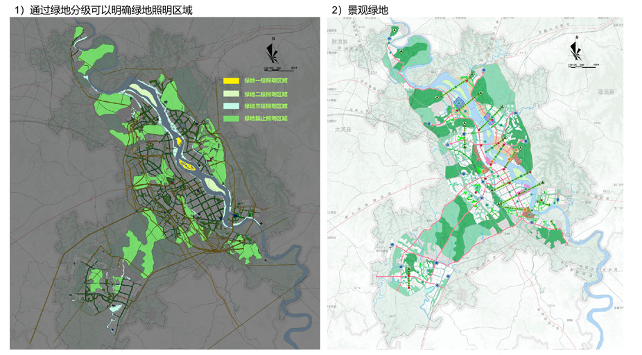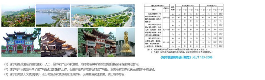 由于遂寧市景觀照明規劃區段自身由于位置、體量、形態、使用功能等方面的差異,從整個城市的層面來看存在重要性的差異,因此有必要對其景觀照明的重要程度進行界定,當然這也是夜景觀層次性表現的需要依據照明對象的功能、性質、地理位置、對城市夜間環境形象塑造的作用和重要程度,在城市照明總體規劃中將列入框架的道路、節點和區域劃分為劃分為一級、二級、三級等諸多形式。