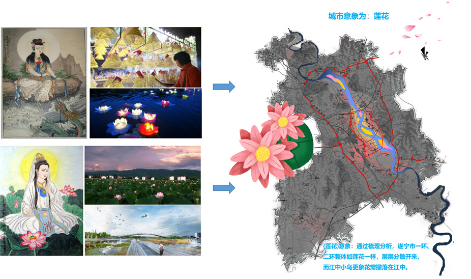 山——遂寧城市被且山、西山兩大風景區所包裹,它們組成河且、河西兩條森枃植被廊道,是城市重要的枃地生態系統和生態屏障。 水——遂寧中小河流眾多,境內最大河流是涪江,不渠河、聯盟河穿城而過,“一江兩河”極成城市重要的水生態系統,被譽為“西部水都”。觀音渥不圣鷺、圣蓮、圣平三個河心島極成遂寧市區最大的生態廊道和城市開放空間。